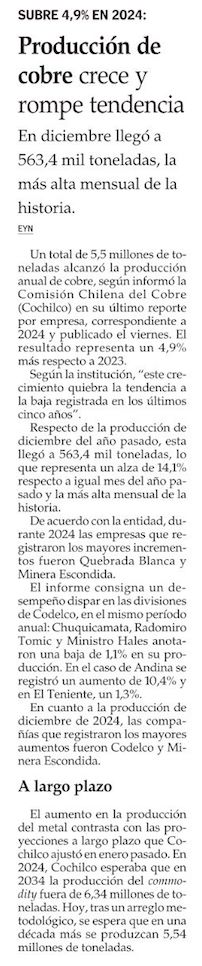 Producción de cobre de Chile rompe tendencia bajista de dos décadas y cierra 2024 con crecimiento del 4,9% - (Diario Financiero)