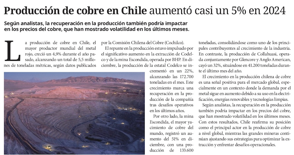 Producción de cobre de Chile rompe tendencia bajista de dos décadas y cierra 2024 con crecimiento del 4,9% - (Diario Financiero)