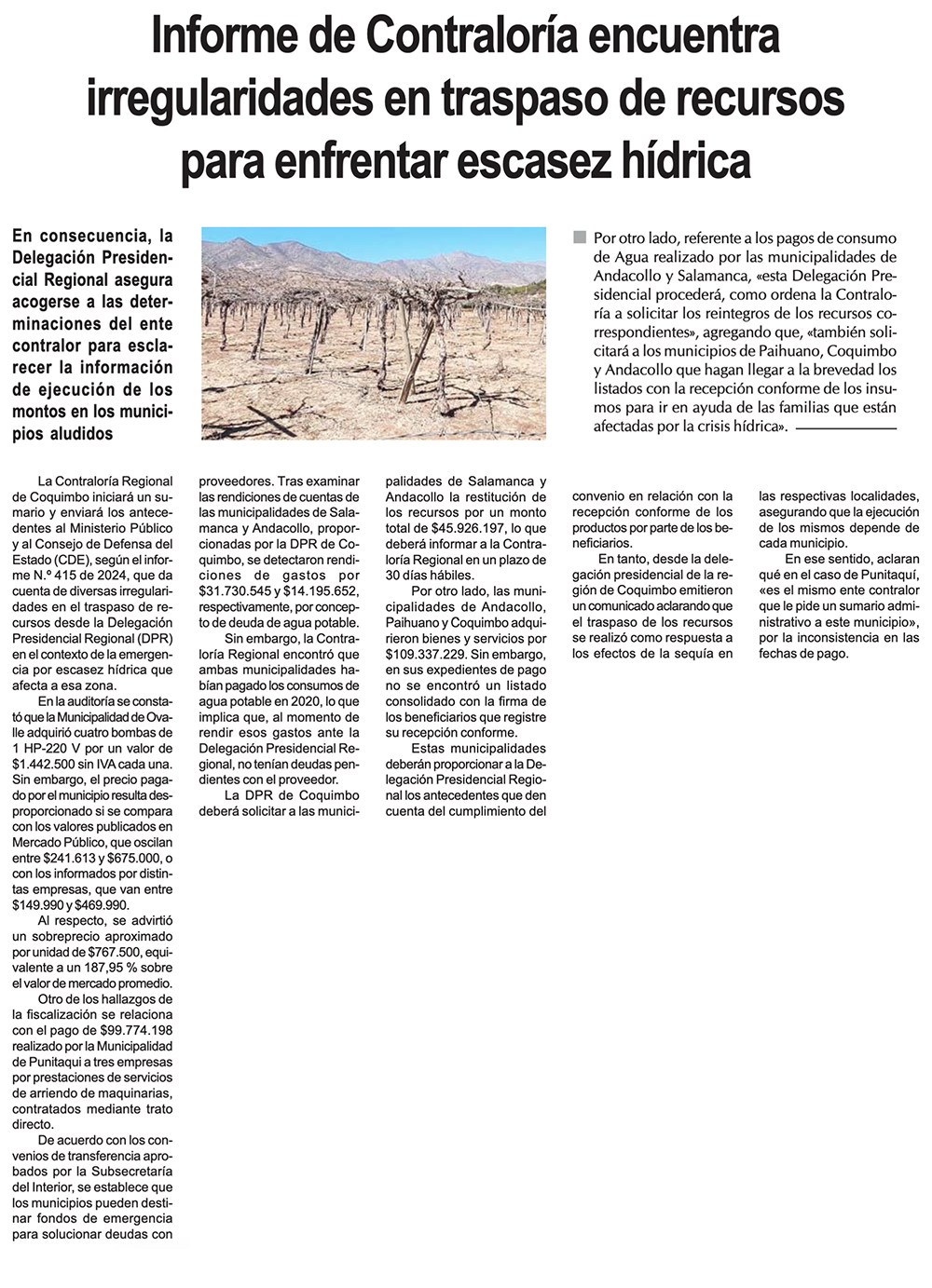 Detectan irregularidades en traspaso de recursos para paliar escasez hídrica - (El Día)