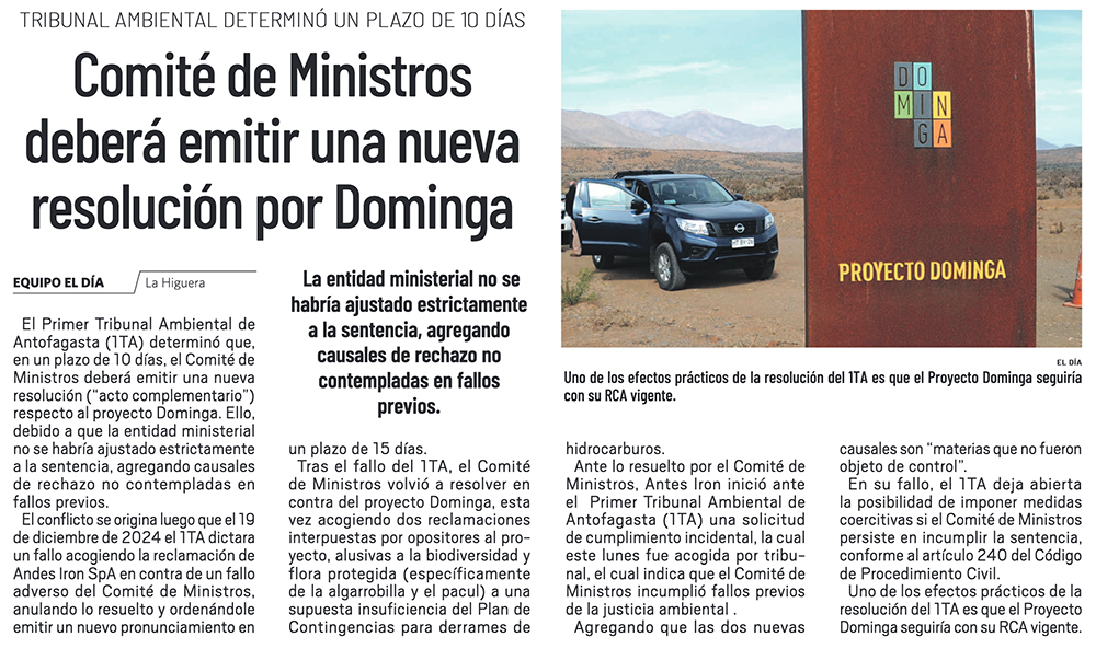 Primer Tribunal Ambiental ordena al Comité de Ministros volver a votar Dominga por incumplir sentencia anterior - (Diario Financiero)