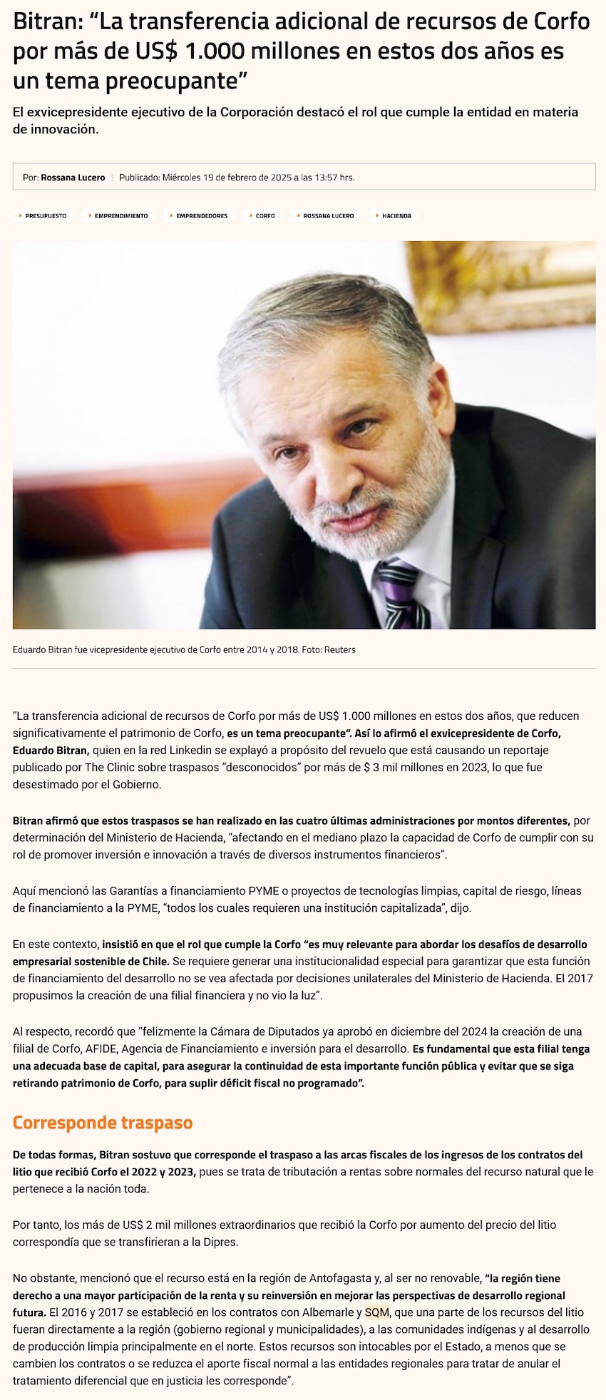Dos ex vicepresidentes ejecutivos de Corfo cuestionan traspasos de recursos al fisco - (El Mercurio de Santiago)