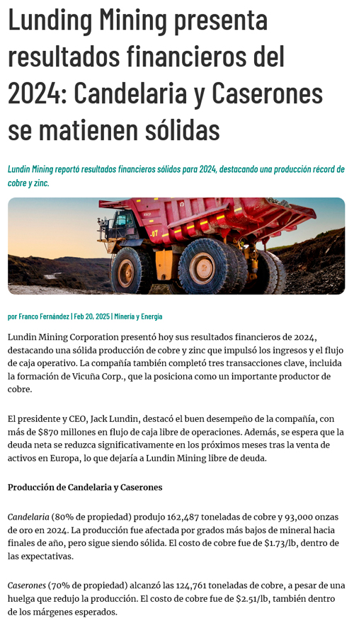 Lundin Mining entregó los resultados de producción 2024 de Candelaria y Caserones - (reporteminero)