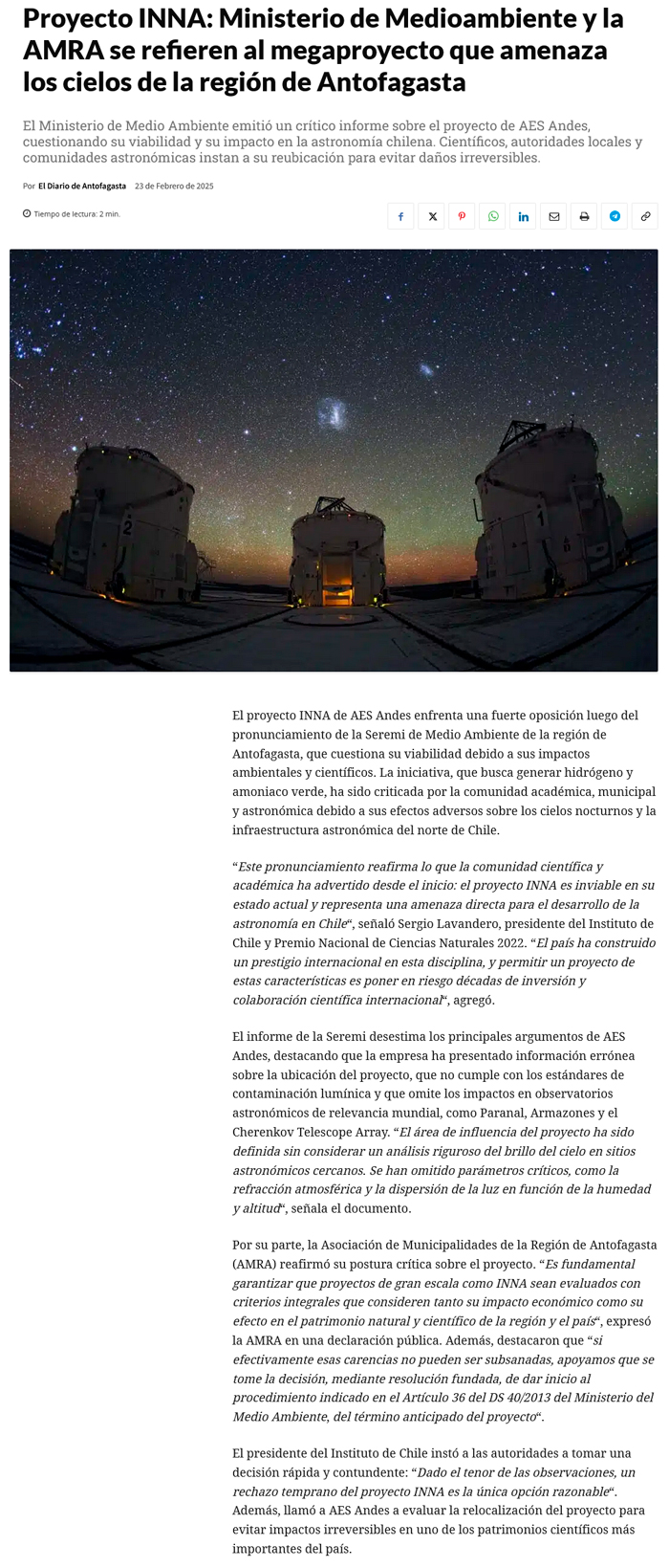 INNA: Medio Ambiente remite informe de 31 páginas con múltiples observaciones al proyecto - (El Mercurio de Antofagasta)