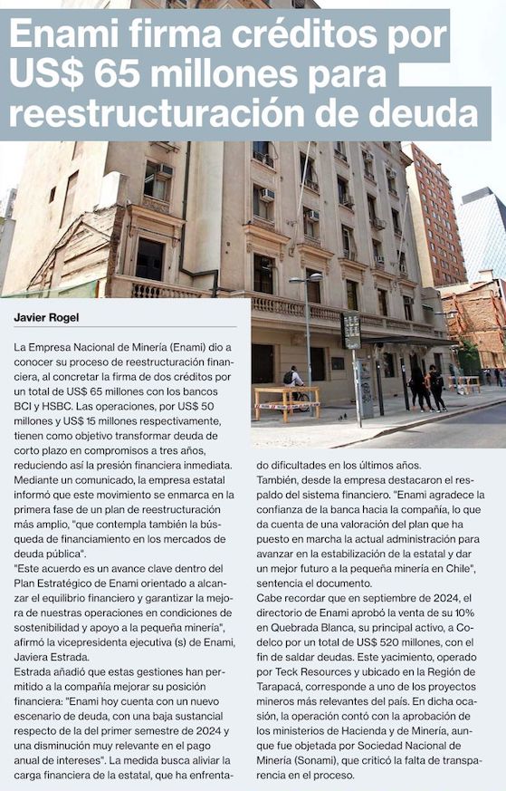 Enami inicia reestructuración de deuda y firma créditos por US$ 65 millones - (Diario Financiero)