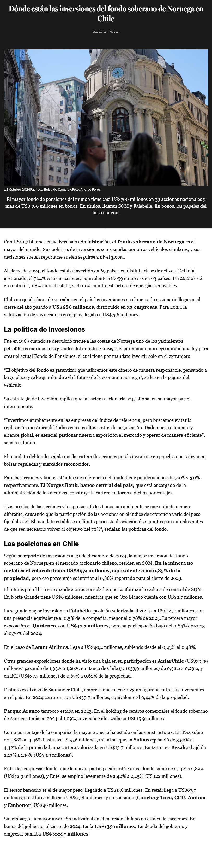 Dónde están las inversiones del fondo soberano de Noruega en Chile - (Pulso)