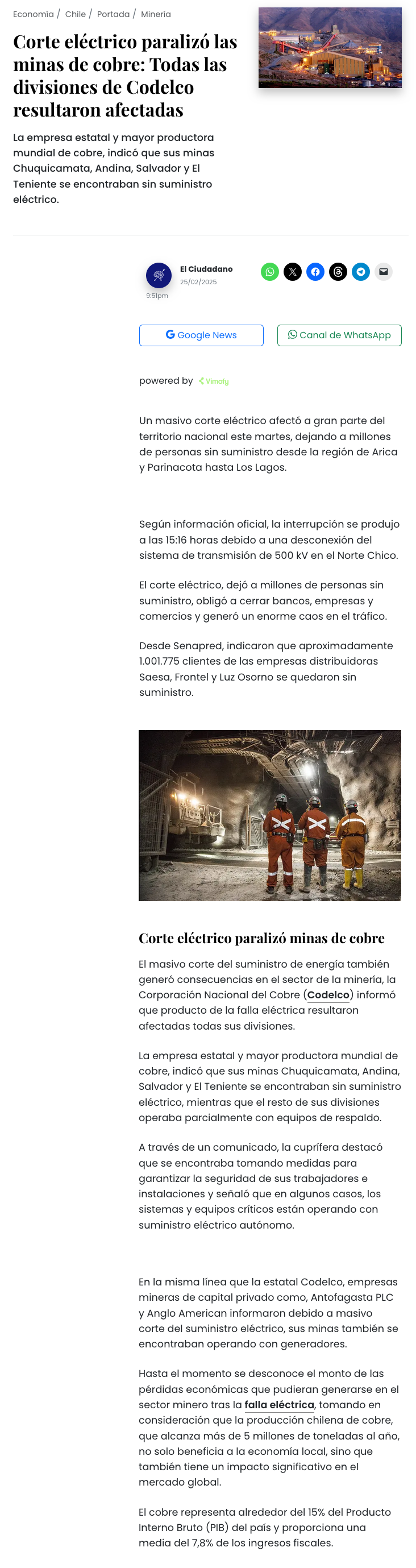 Masivo corte de energía afecta operaciones del sector minero, telecomunicaciones y transporte - (Diario Financiero)