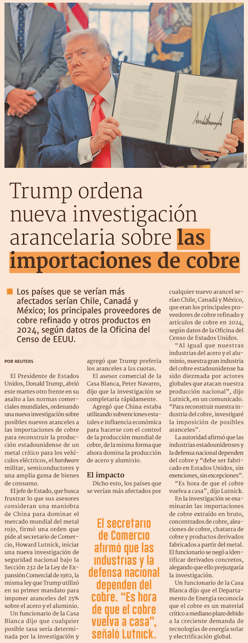 Casa Blanca inicia investigación con miras a aplicar aranceles a envíos de cobre a EE.UU. - (El Mercurio de Santiago)