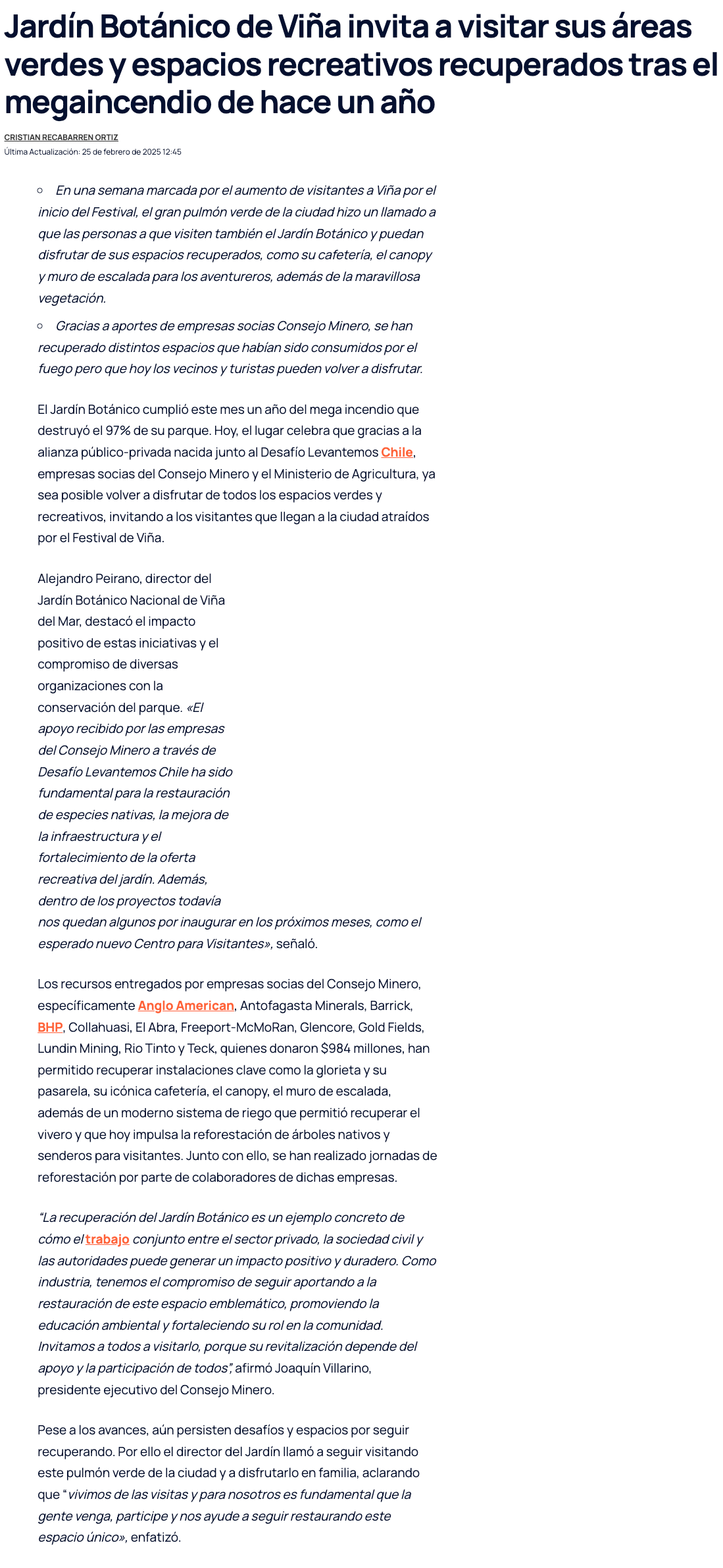 Jardín Botánico de Viña invita a visitar sus áreas verdes y espacios recreativos recuperados tras el megaincendio de hace un año - (minerialocal.cl)