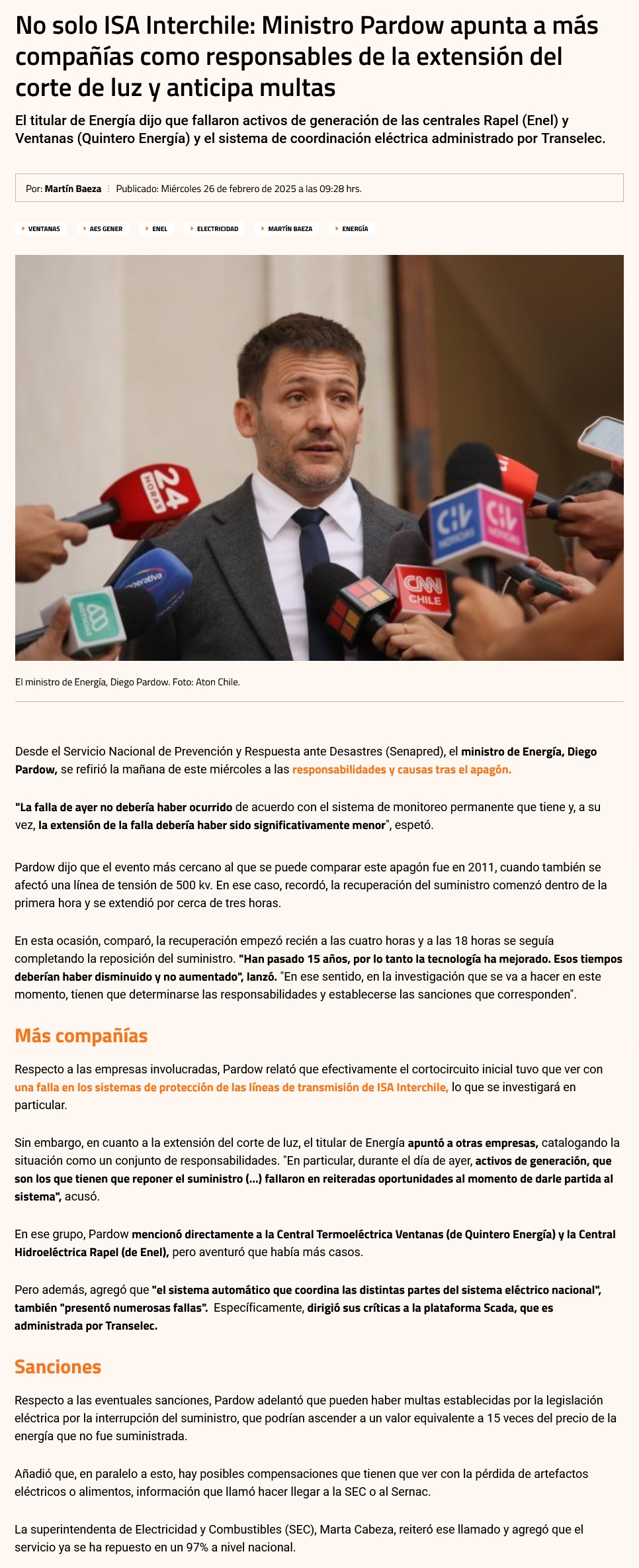 Presidente de ISA subraya que actuó con rapidez tras falla de su línea y Coordinador dice que empresa se tomó “mucho” tiempo - (El Mercurio de Santiago)