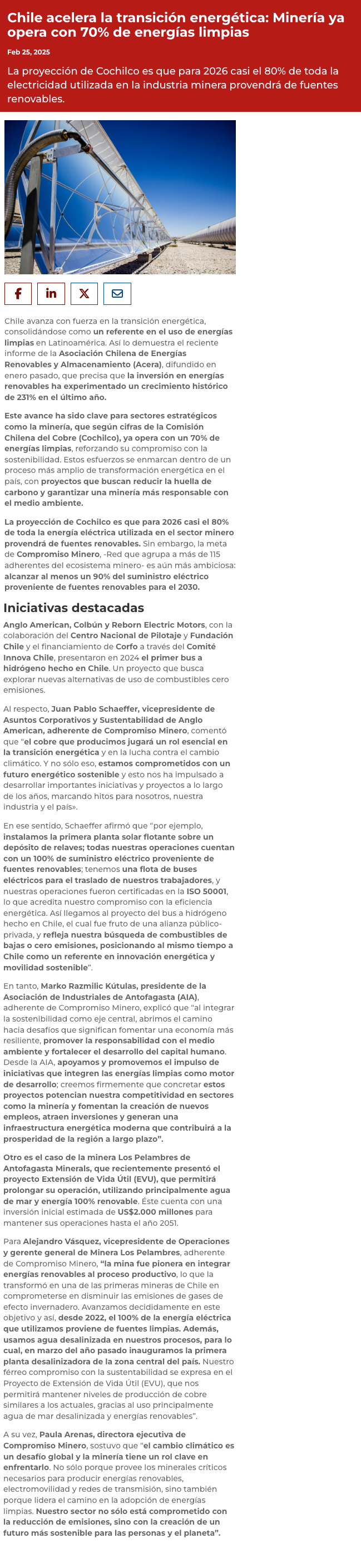 Chile acelera la transición energética y la minería ya opera con 70% de energías limpias - (guiaminera.cl)
