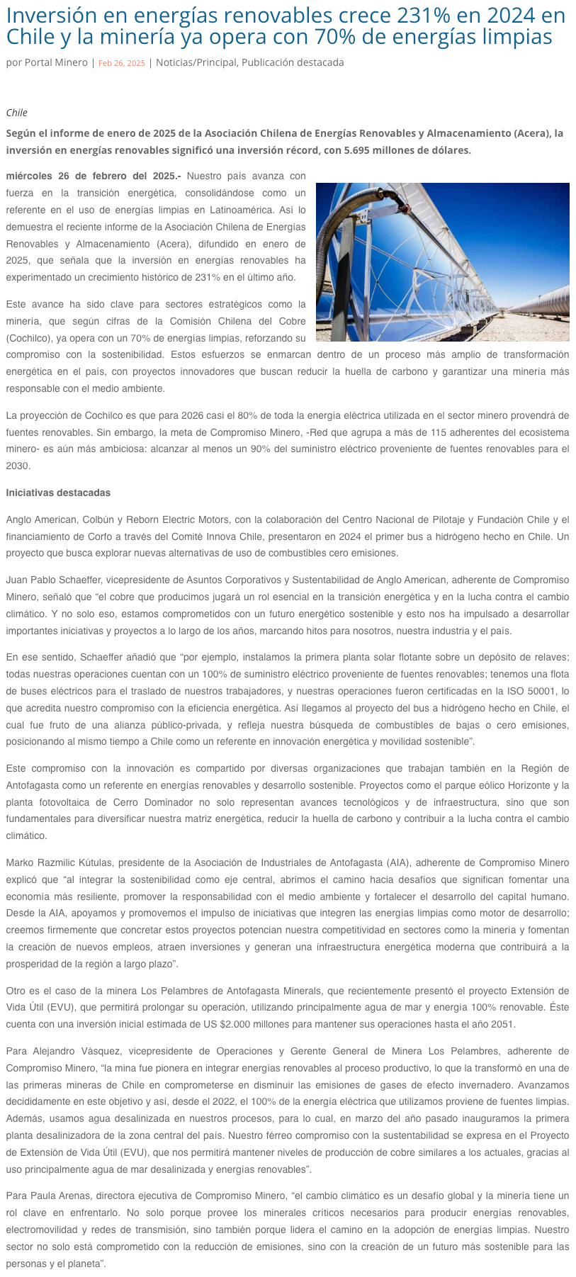 Chile acelera la transición energética y la minería ya opera con 70% de energías limpias - (guiaminera.cl)