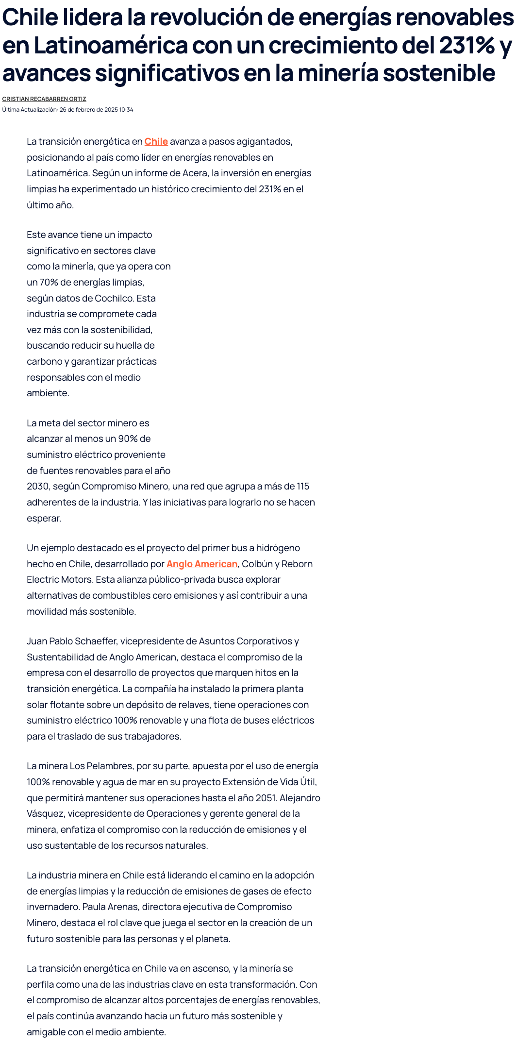 Chile acelera la transición energética: Minería ya opera con 70% de energías limpias - (mch.cl)