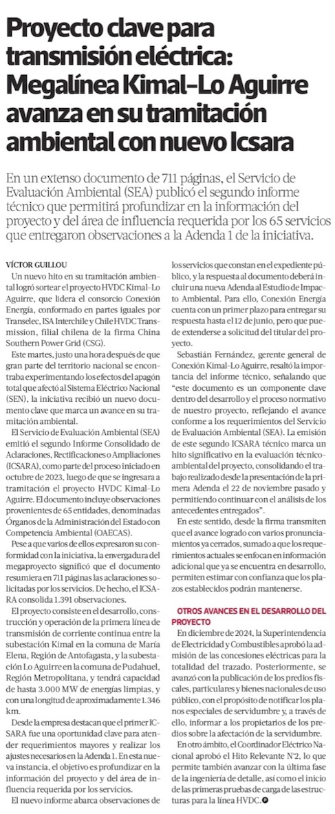 Kimal-Lo Aguirre: proyecto clave para el sistema eléctrico avanza en su evaluación - (El Mercurio de Antofagasta)