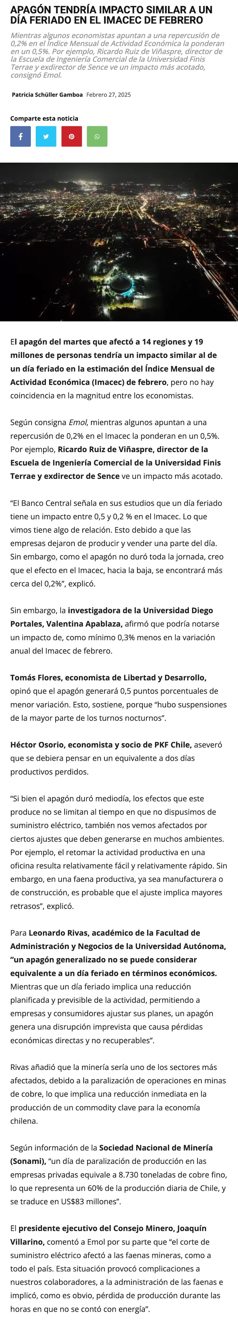 Masivo apagón tendría un impacto similar a un día feriado en el Imacec de febrero - (puranoticia.cl)