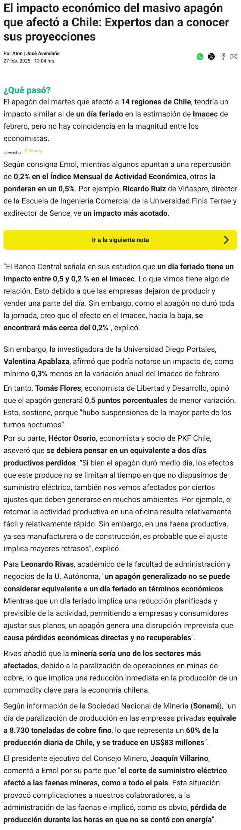 Masivo apagón tendría un impacto similar a un día feriado en el Imacec de febrero - (puranoticia.cl)