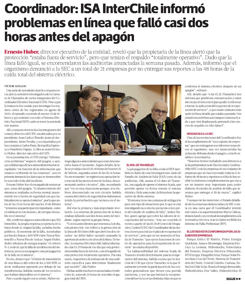 Coordinador enfrenta al Congreso a una semana de apagón: revela nuevos detalles sobre papel de ISA Interchile y asegura objetividad - (Diario Financiero)