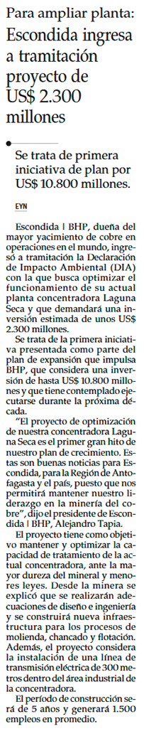 Escondida ingresa DIA por US$ 2.300 millones para la optimización de concentradora - (El Mercurio de Antofagasta)