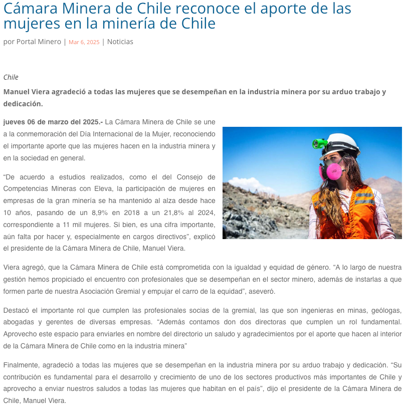 La Cámara Minera de Chile reconoce el aporte de las mujeres en la minería chilena - (portalinnova.cl)