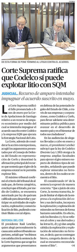 Corte Suprema ratifica que Codelco sí puede explotar litio con SQM - (El Mercurio de Calama)