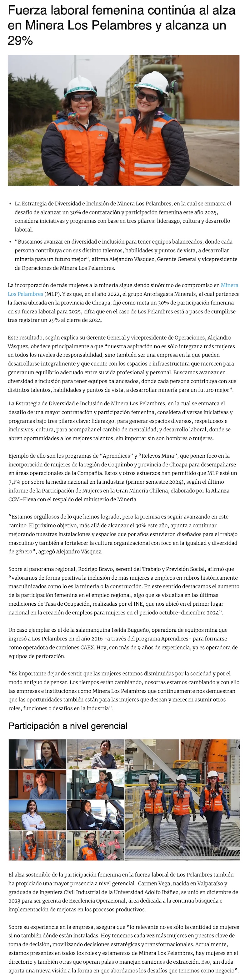 Fuerza laboral femenina continúa al alza en Minera Los Pelambres y alcanza un 29% - (radiomontecarlo.cl)
