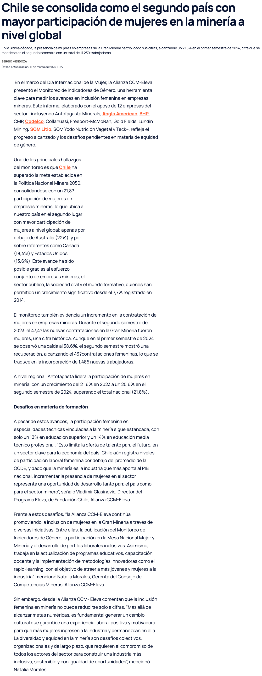 Chile se consolida como el segundo país con mayor participación de mujeres en la minería a nivel global - (nuevaminería online)