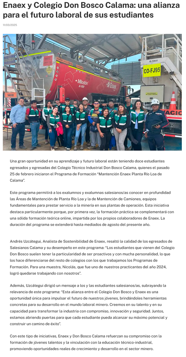 Alianza Enaex-Don Bosco potencia a los egresados - (La Estrella)