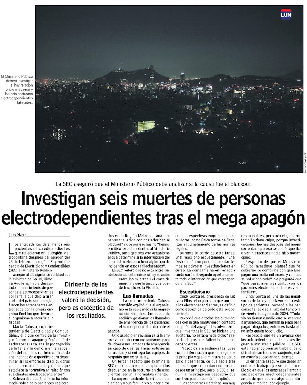 SEC envía antecedentes a la Fiscalía por seis electrodependientes fallecidos en apagón de febrero - (Diario Financiero)