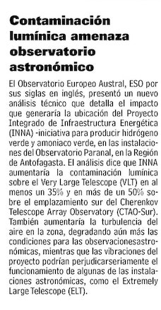 ESO asegura que INNA generará contaminación lumínica, vibraciones, turbulencias y polvo - (El Mercurio de Antofagasta)