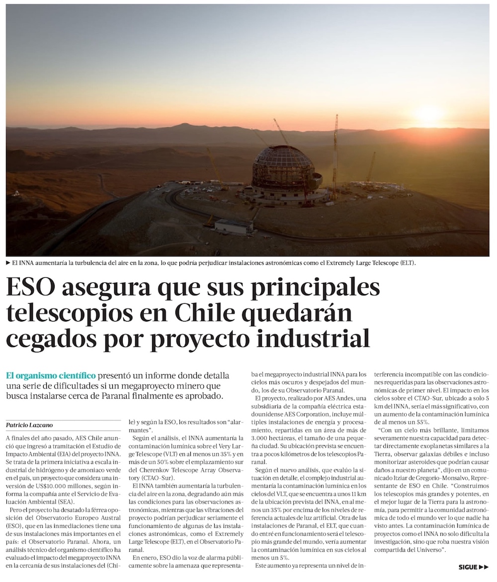 ESO asegura que INNA generará contaminación lumínica, vibraciones, turbulencias y polvo - (El Mercurio de Antofagasta)