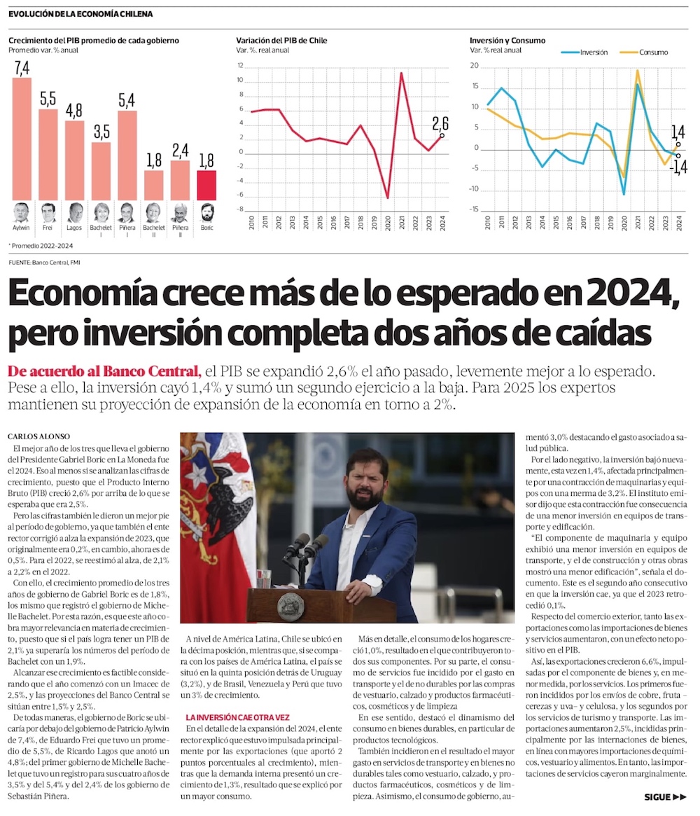 PIB de Chile cierra 2024 mejor a lo previsto y sienta camino para otro año de expansión sobre el 2% - (Diario Financiero)