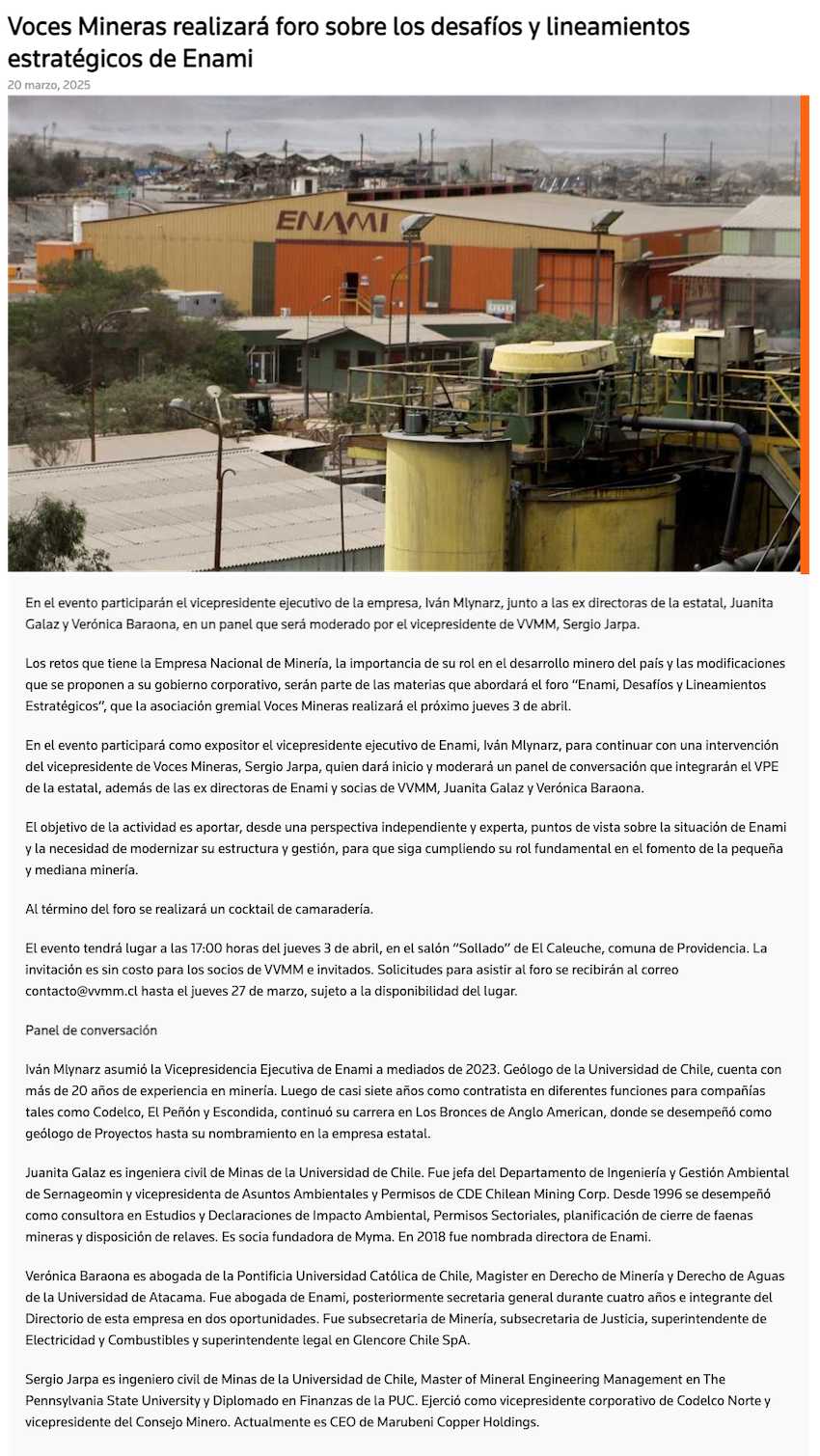 Voces Mineras realizará foro sobre desafíos y lineamientos estratégicos de Enami - (mch.cl)