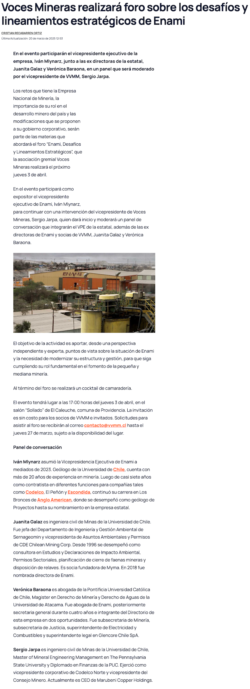 Voces Mineras realizará foro sobre desafíos y lineamientos estratégicos de Enami - (mch.cl)