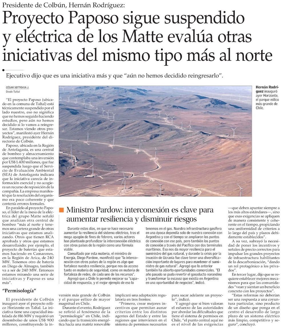 Colbún mantiene suspendido Bombeo Paposo y Pardow espera que SEC formule cargos por apagón en el primer semestre - (Diario Financiero)