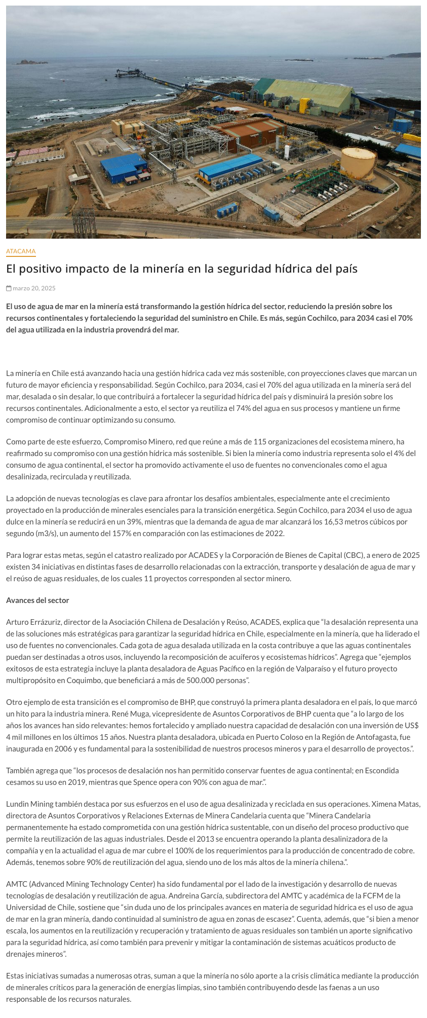 Compromiso Minero resalta contribución del sector a la seguridad hídrica del país - (mch.cl)
