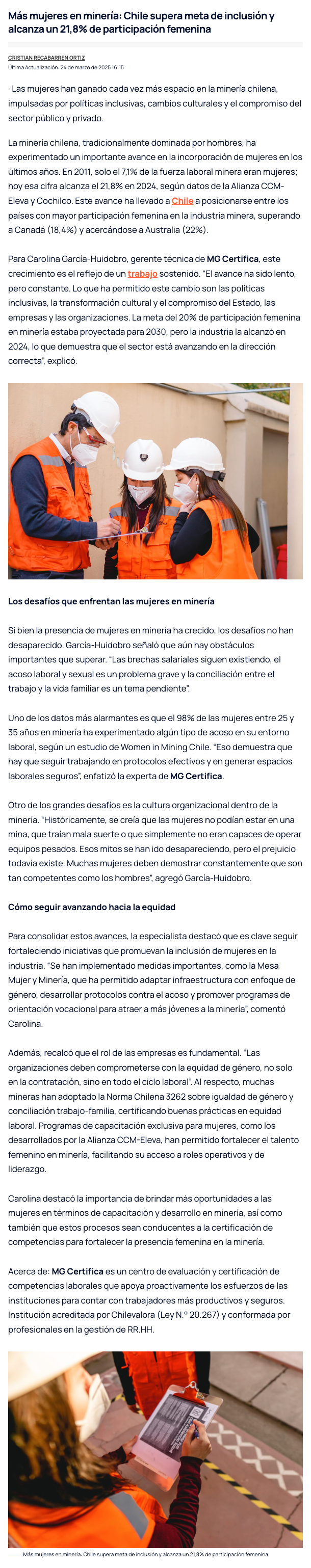 Más mujeres en minería: Chile supera meta de inclusión y alcanza un 21,8% de participación femenina - (poderyliderazgo)