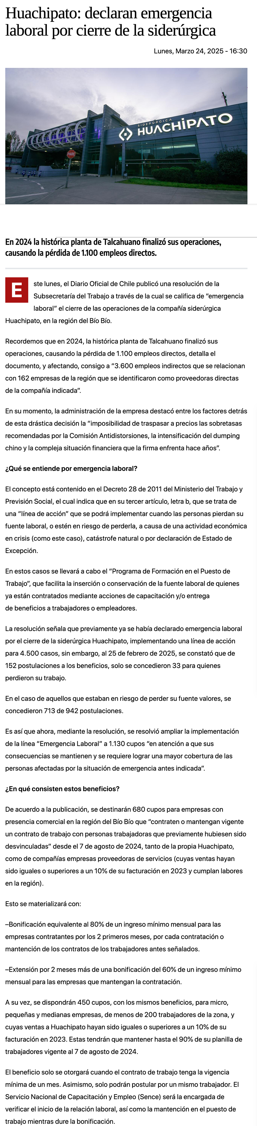 Gobierno anuncia extensión de subsidios laborales para mitigar impacto del cierre de Huachipato - (sabes.cl)