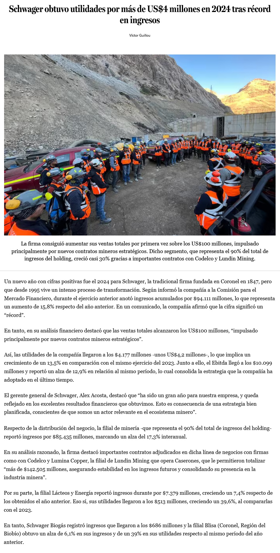 Schwager suma nuevo contrato en el sector minero y cierra con Lundin Mining - (Diario Financiero)
