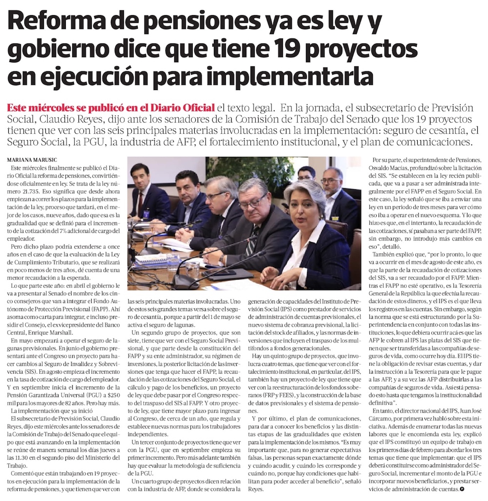 Reforma de pensiones se publica en el Diario Oficial y comienzan a regir los plazos de implementación - (Diario Financiero)