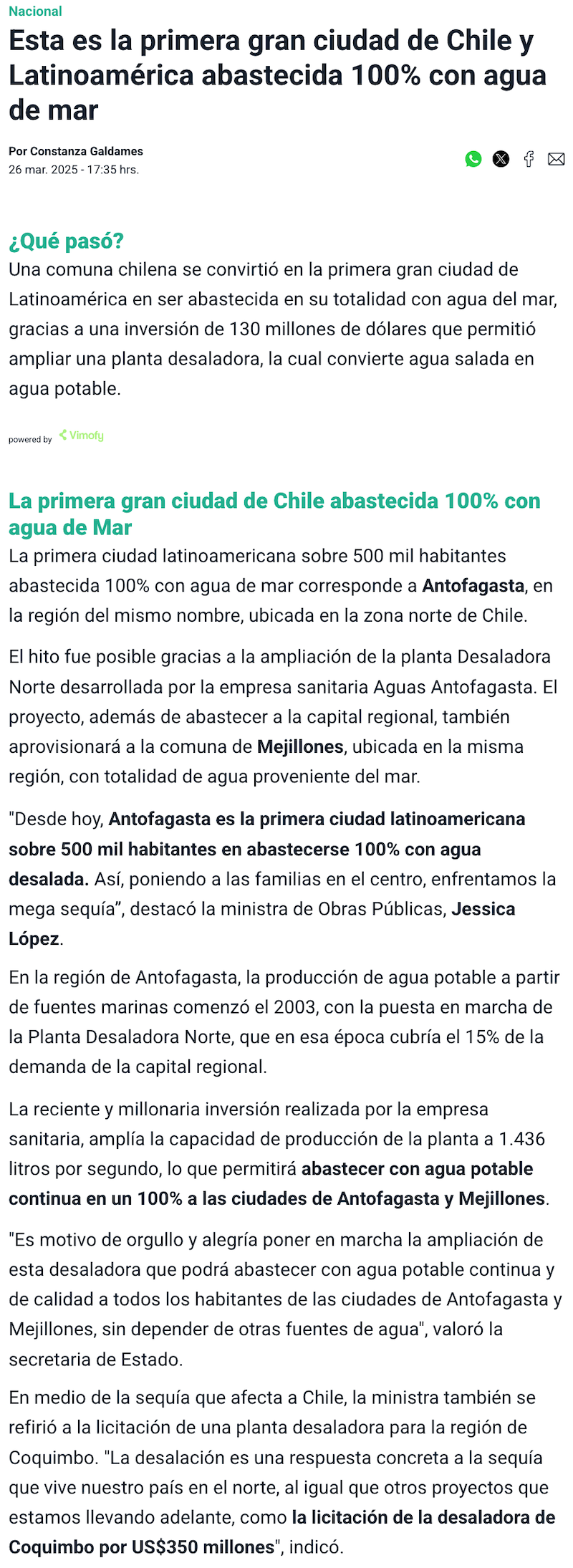 Antofagasta y Mejillones serán abastecidas en 100% por agua desalada - (soyantofagasta)