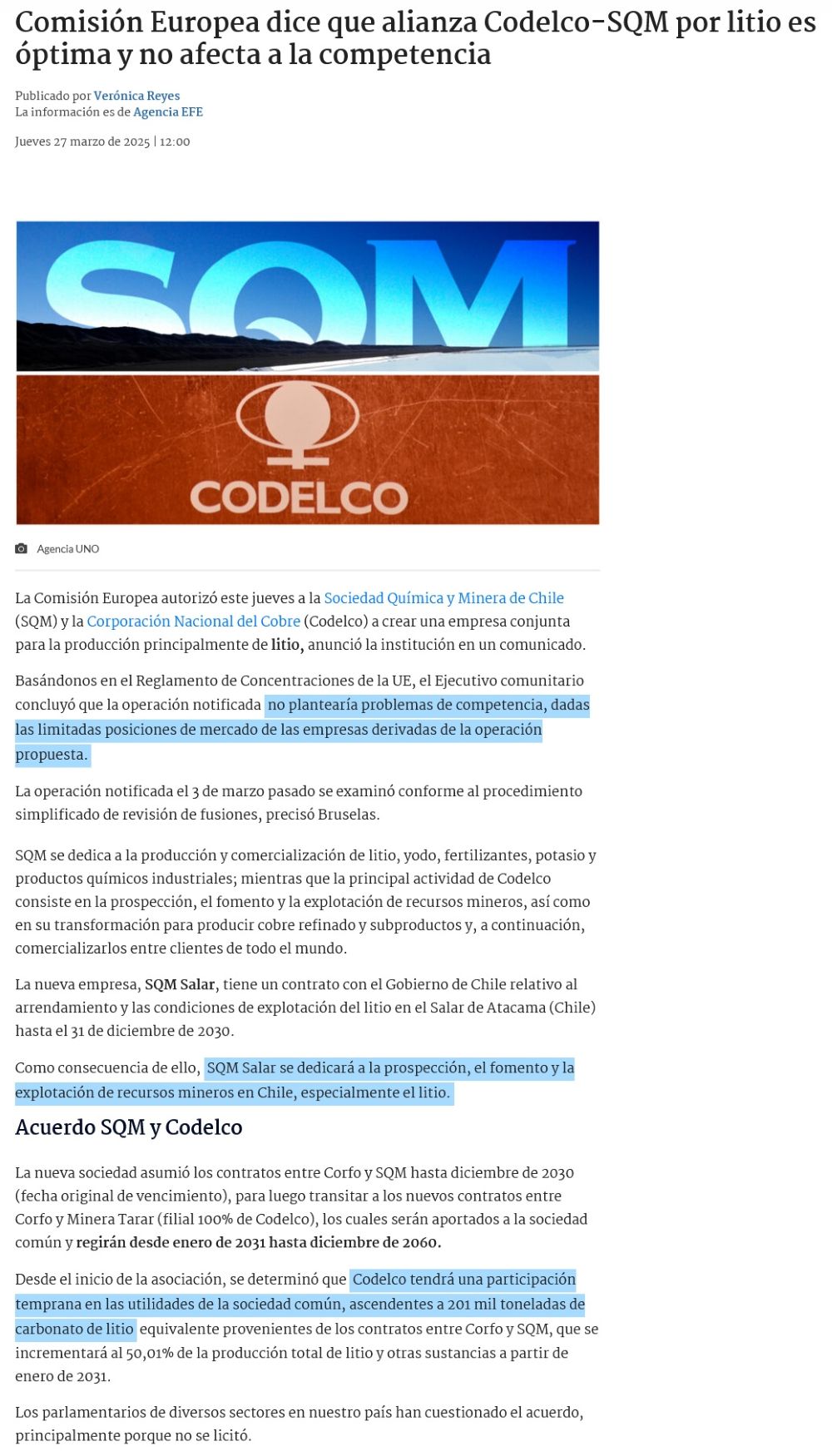 Comisión Europea da luz verde a acuerdo Codelco-SQM: solo falta China y Chile - (Diario Financiero)