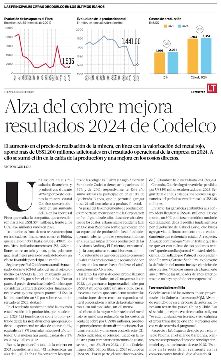 Codelco entregó al país US$1.534 millones en 2024, 8% más que en 2023 - (La Segunda)