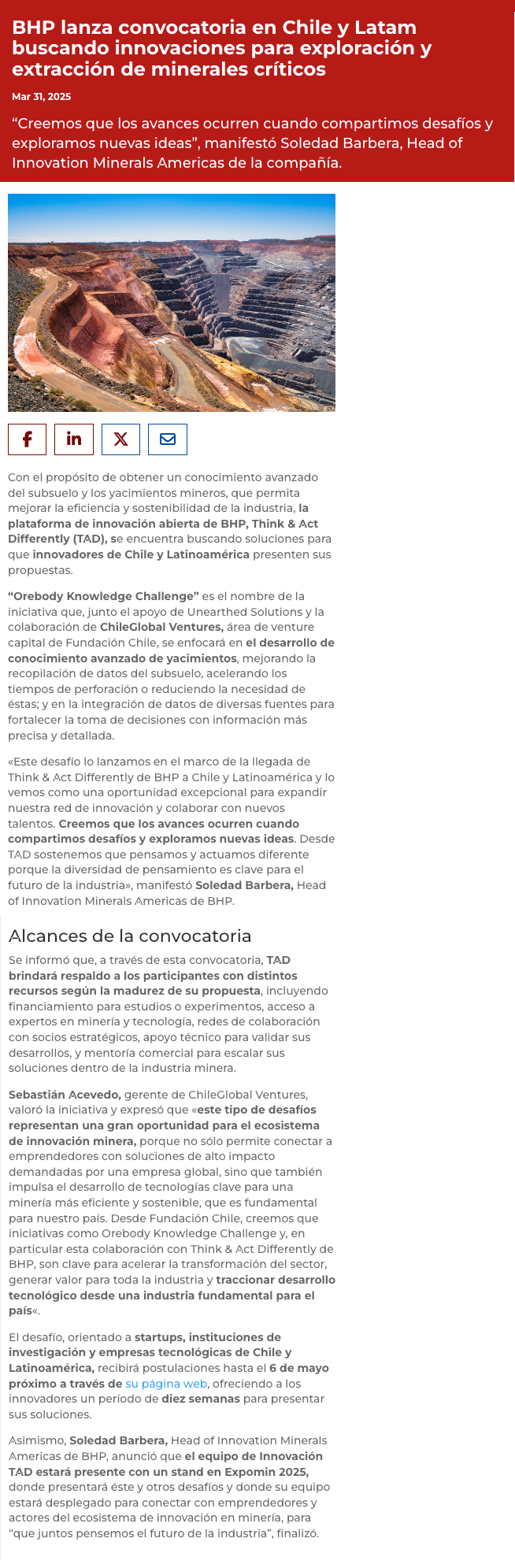 A través de su plataforma Think & Act Differently “TAD”: BHP lanza convocatoria en Chile y Latam buscando innovaciones para exploración y extracción de minerales críticos - (mvcomunicaciones.cl)