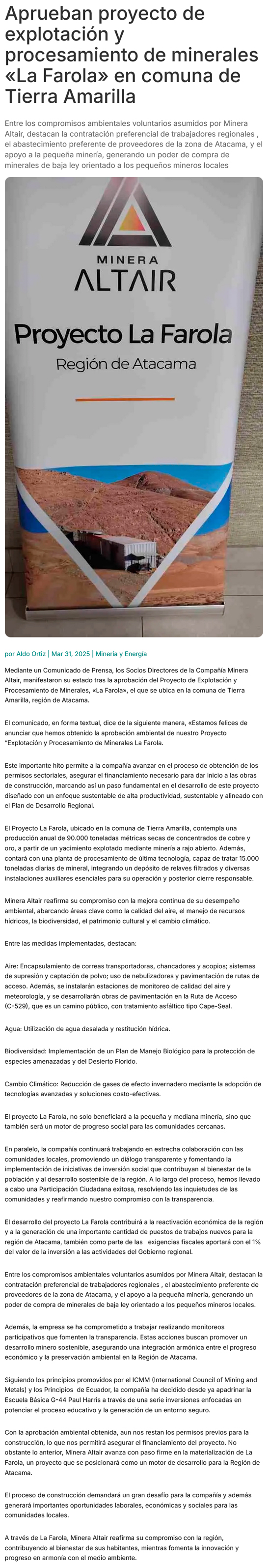 El SEIA aprobó el proyecto minero "La Farola" - (El Diario de Atacama)