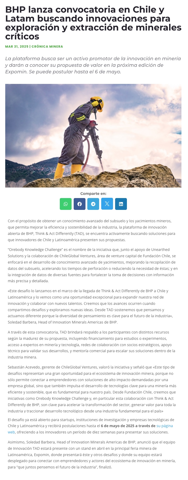 A través de su plataforma Think & Act Differently “TAD”: BHP lanza convocatoria en Chile y Latam buscando innovaciones para exploración y extracción de minerales críticos - (mvcomunicaciones.cl)