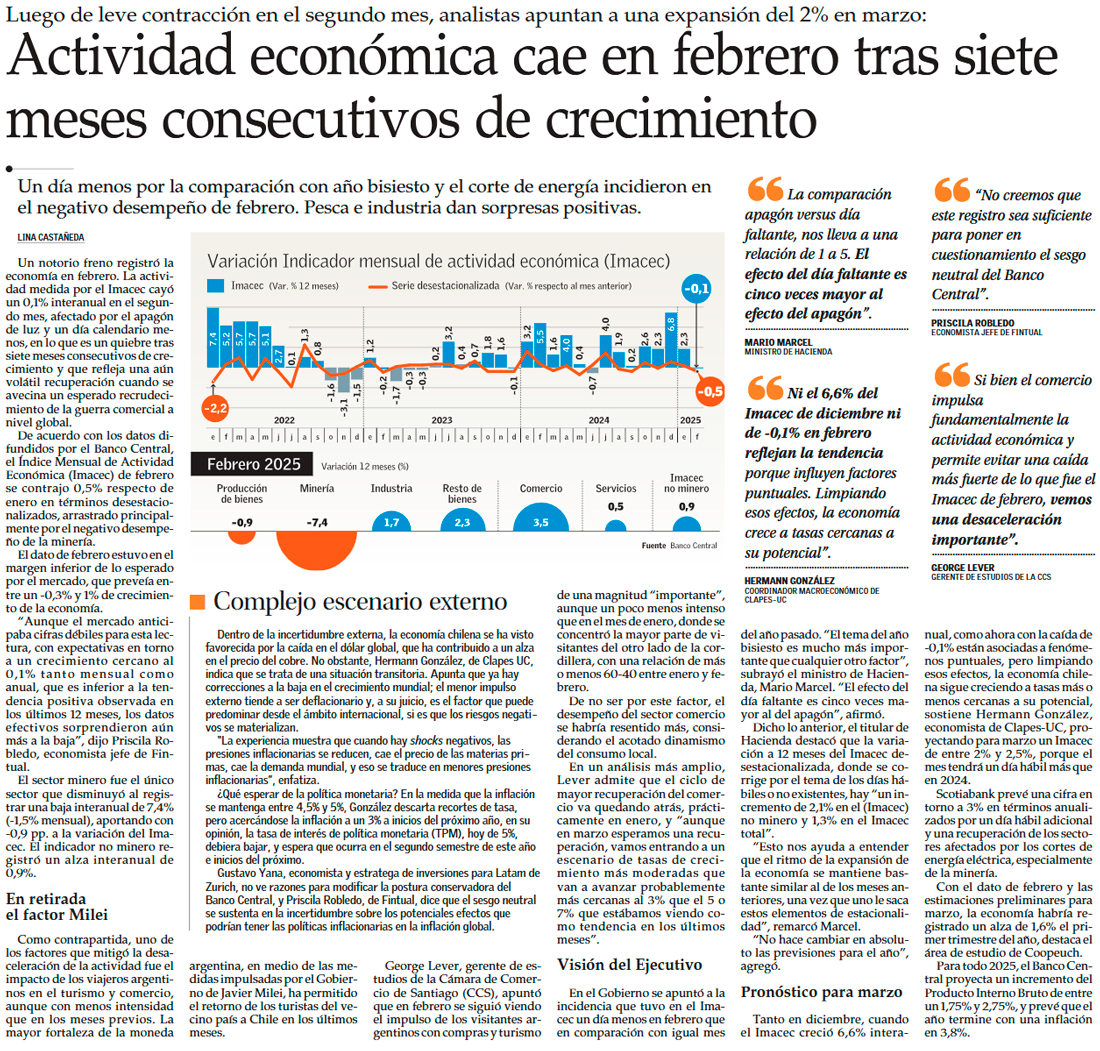 Actividad económica cae 0,1% en febrero, pero retomaría alza sobre el 2% en marzo - (Diario Financiero)