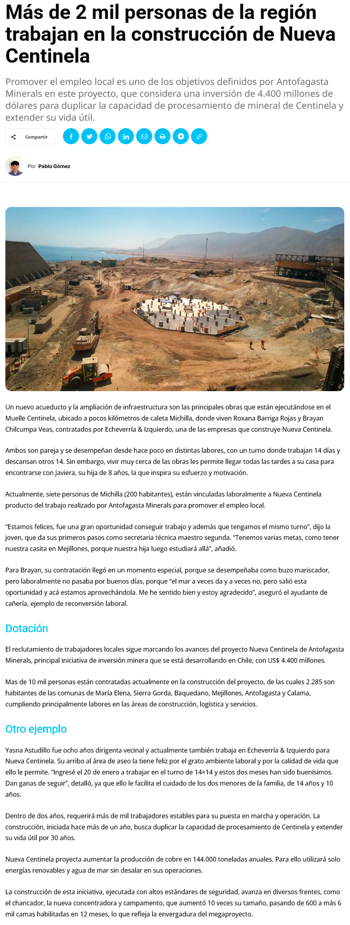 Más de 10 mil personas trabajan en la ejecución de Nueva Centinela - (El Mercurio de Antofagasta)