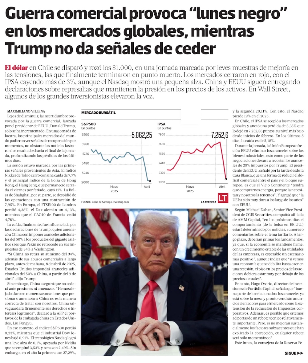 Mercados globales extienden baja en medio de caos por aranceles: pérdidas suman US$ 10 billones - (El Mercurio de Santiago)