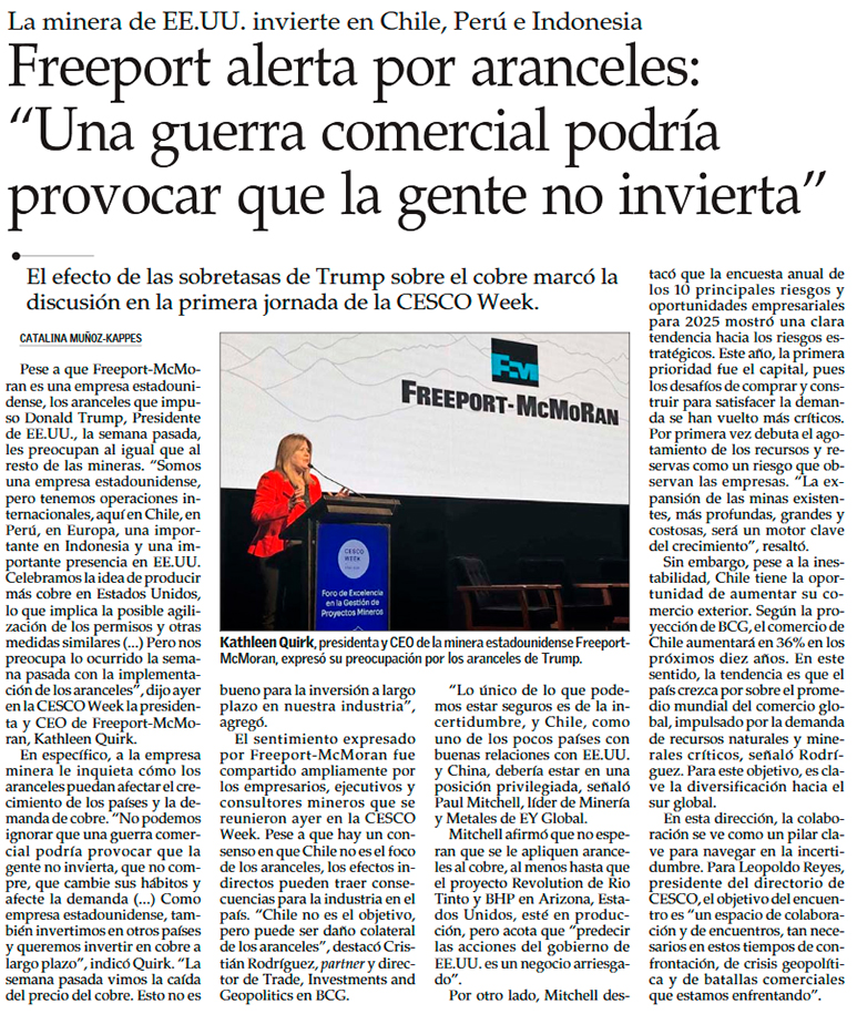 Kathleen Quirk, CEO de Freeport-McMoRan, reconoce preocupación porque guerra comercial pueda afectar la demanda por cobre - (Pulso)