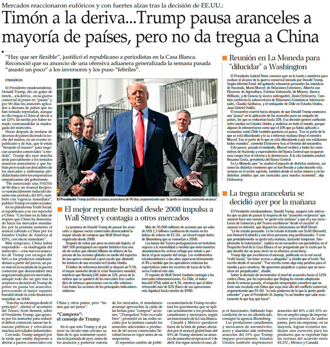 Trump anuncia pausa para países que no aplicaron aranceles de represalia, mientras Chile evalúa alcances - (Diario Financiero)