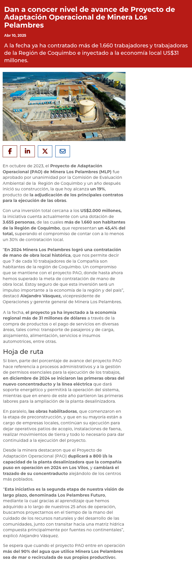 A seis meses del inicio de la construcción: Proyecto de Adaptación Operacional de Minera Los Pelambres alcanza un 19% de avance - (madero.cl)